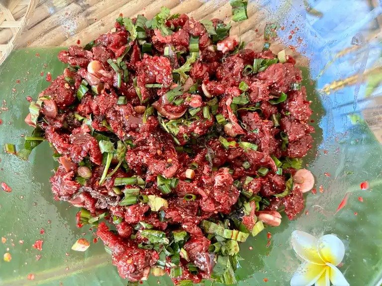 Larb is a traditional dish in Laos and neighboring regions, often prepared as a salad made with raw or lightly cooked meat. The type of meat varies widely and may include beef, pork, fish, or wild game, depending on local customs and availability.