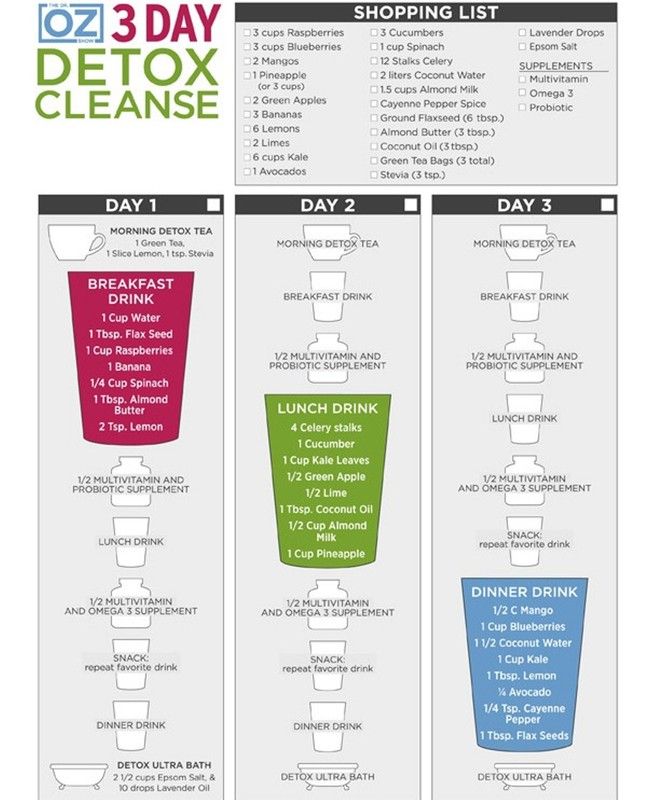 There are many detoxification programs and detox recipes, depending on your individual needs. Many programs follow a seven-day schedule because, as Bennett explains, "it takes the body time to clean the blood." His program involves fasting on liquids for two days, followed by a carefully planned five-day detox diet to allow the digestive system to rest. Page recommends a three- to seven-day juice fast (drinking only fresh fruit and vegetable juices and water) as an effective way to release toxins.