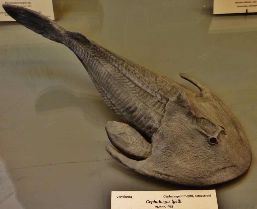 One of the best-known examples is Cephalaspis. This small, bottom-dwelling fish had a wide, bony head shield shaped almost like a horseshoe. The plate covered the brain and sensory organs — critical structures in a world filled with larger marine predators. While its body remained more flexible, the reinforced skull acted as a defensive barrier against attacks from above.